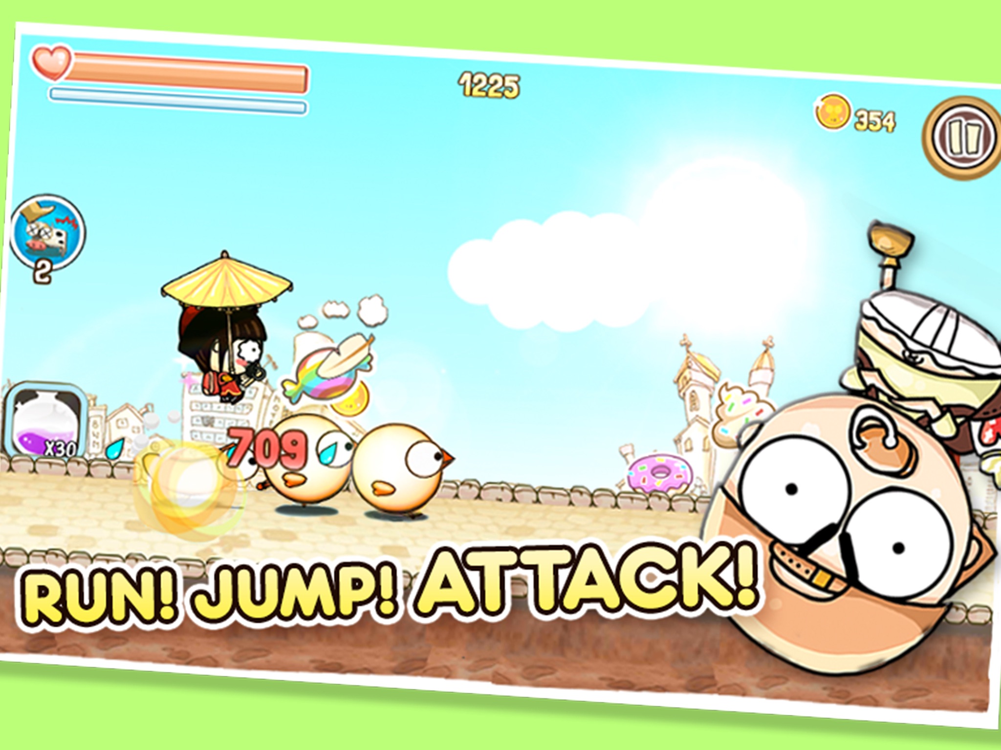 - Drink milk to recover HP and eat candy to become invincible on the way