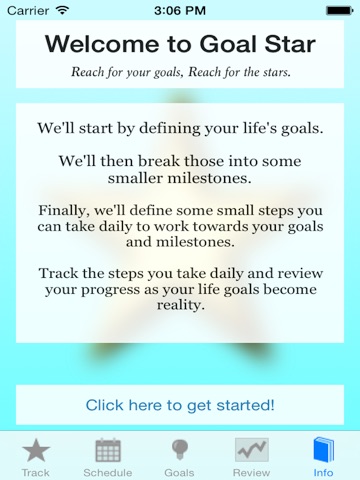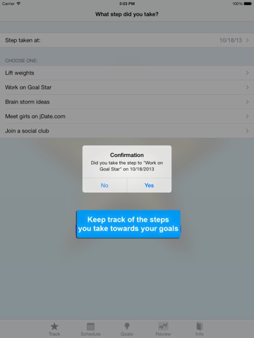 Goal Star will give you weekly, monthly and even yearly reports to track your progress towards your goals. This is based on the number of times per week you had planned to complete steps towards your goals and the number of times you actually logged those steps.