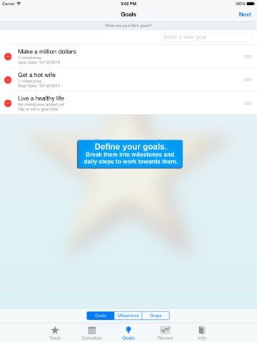 For all your goals and milestones, you go through and come up with a set of steps that you can take daily or weekly to work towards those goals. You can even schedule these steps to be at particular times of the week and add reoccurring reminders to your calendar if youd like.