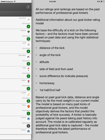The model is based on many past kicks of professional goal kickers, and the model objectively derives the factors that predict the probability of kick success. A kicker is basically judged against his peers taking past history into account. The model is re-calibrated regularly as additional goal kick data is captured – the model therefore reflects the latest performance of professional goal kickers.