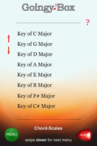 Play back and forth through the scale of any key using its main chords including, major, minor keys, naturals and sevenths.