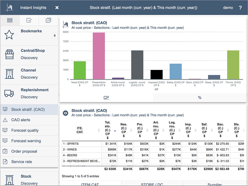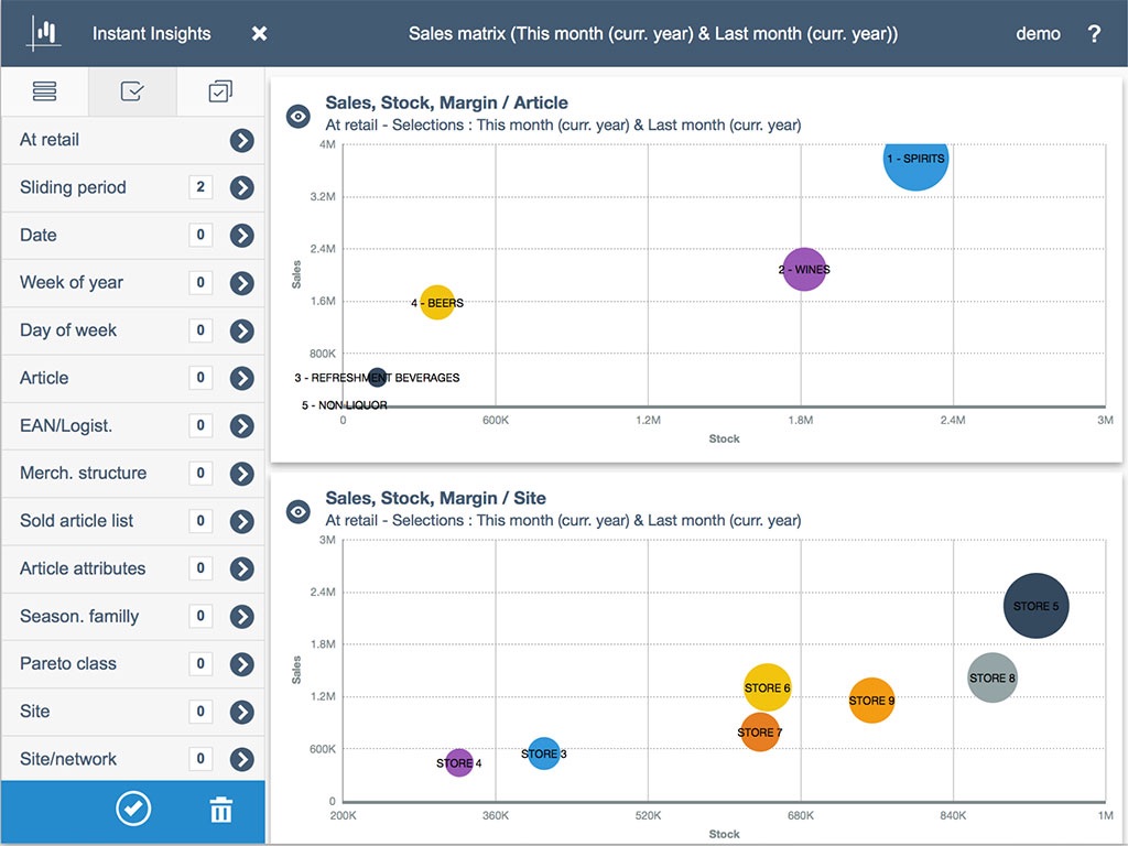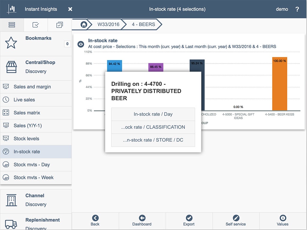 - Intuitive drill down on time period (year / quarter / month / week / day), geographical network (country / region / city / store) or merchandise structure (category, shelf group, classification, article)