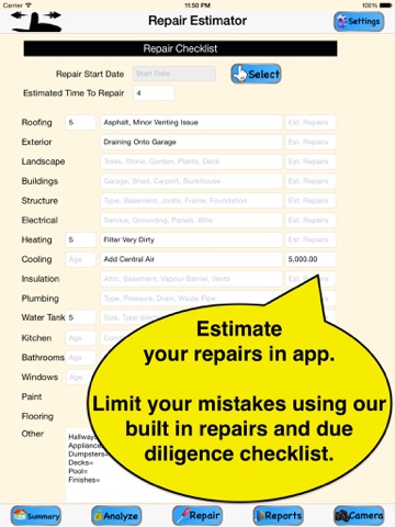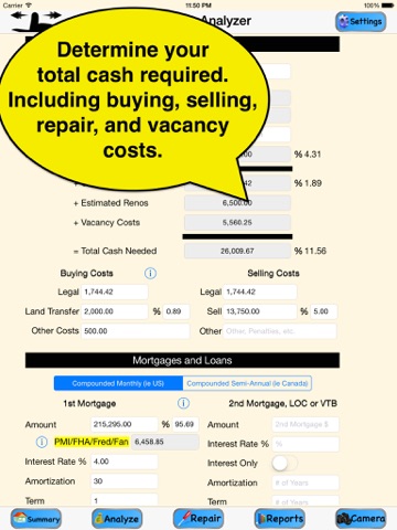 - Analyzer screen with all your cash requirements, monthly expenses, and mortgage information