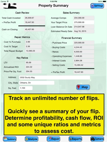 This app will be your flip buddy and companion for all your flips. Quickly analyze properties, keep track of your cash, ROI and profit. View maps, do your due diligence and repair checklists, and take pictures while on site.