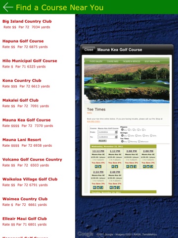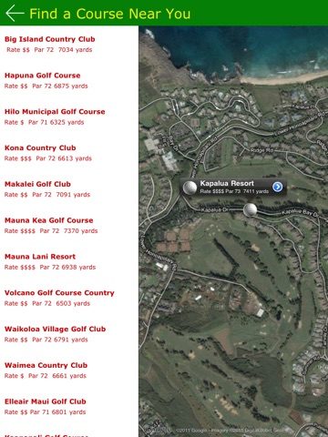 With Golf Finder Hawaii, you get detailed golf course information for over 50 public courses on the Hawaiian Islands. Review golf courses that are near your hotel by activating the "Find a Course Near You" feature. Review the course details while planning your golf outing. Just scroll over the map and check out the cost ratings of each course. Also, view the course scorecards. Reserve your tee time from your iPad or iPhone now!