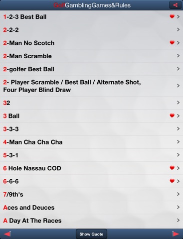 Whether for money, drinks or just to add a little excitement to your next round - download this app. Includes detailed descriptions of the most well known, to the obscure, golf games around. Pick from the list of gambling games on the list and if the game works for you and your group, its a new way to enhance and enjoy your round of golf.
