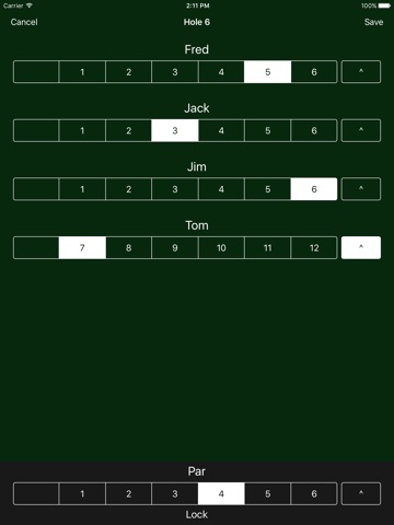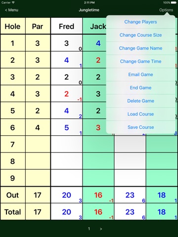 - Running tally lets players know who is leading and by how many strokes.
