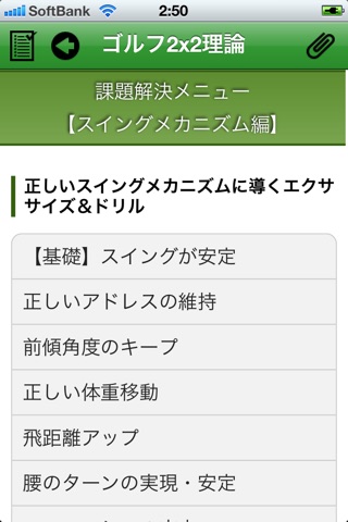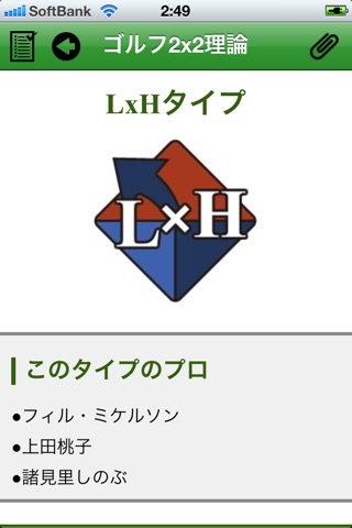 の両輪が必要という、有名プロのコーチとして高く評価される石渡俊彦プロのコーチングコンセプトを一般ゴルファーが自己分析できるようにタイプ分けし、それぞれに適切なドリル、エクササイズ、ストレッチを課題別にインデックス化したものが、アプリ「ゴルフ2x2理論」です。