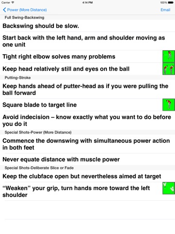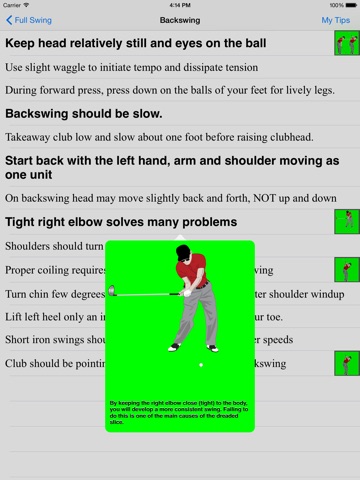 I love the checklist function of this app! Not only does it give you the simple step-by-step instructions, but it also gives you the option to "check off" your progress. The tips are laid out clearly and the illustrations provide a great visual of what is being explained. This is the perfect little tool to have on hand while golfing or practicing at the driving range! Ive found it extremely helpful as a relatively new golfer, and have also shared the app with my friends who are much better golfers. Theyve learned a few new techniques and useful tips too! Definitely recommend.