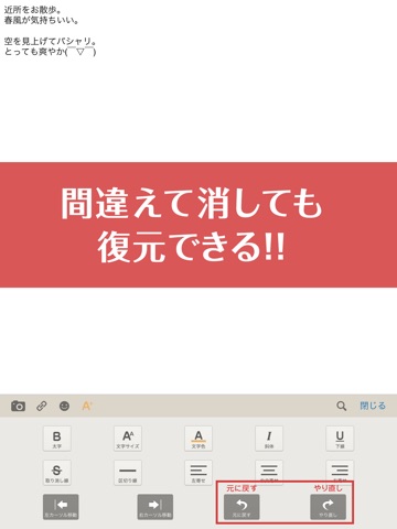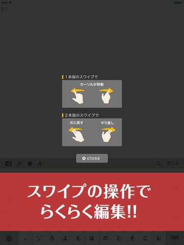 リンクの貼りつけ、絵文字、書体変更はもちろんのこと、元に戻す(Undo)、やり直し(Redo)機能や、スワイプ操作でできるカーソル移動機能がついています。