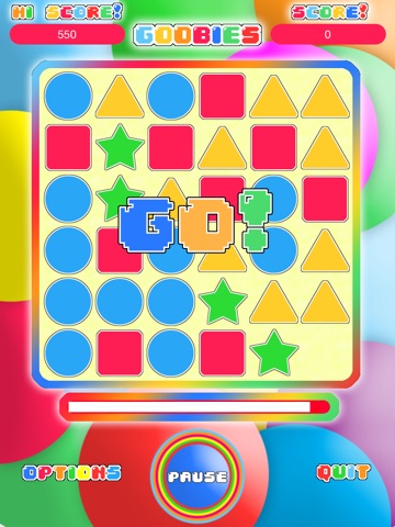 Goobies is the fun popular game kids love! Learn shapes by matching up in a square, up and down, side to side, corner to corner to clear off board! Gameplay is designed for vivid colors and fun music! Score as many points as you can!