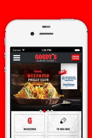 -Παράγγειλε online τα αγαπημένα σου cheese, green, golden burgers, τα νέα extreme burgers, club sandwiches, φρέσκες σαλάτες και άλλα goody’s signature πιάτα…