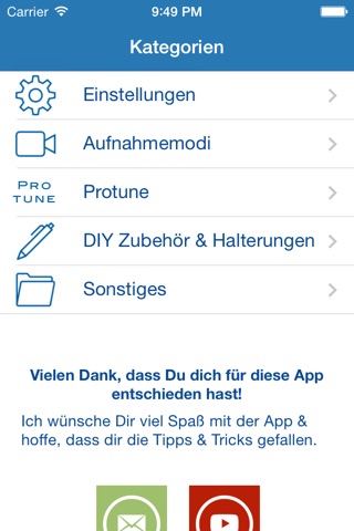 Von ausführlichen Beschreibungen aller Videomodis über Einstellungen, die man unbedingt vornehmen sollte, um die coolsten Action-Clips einzufangen, bis hin zu Anleitungen, cooler Halterungen zum Nachbauen, findest Du alles in dieser App.