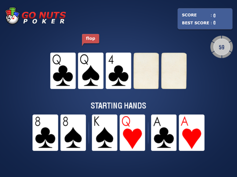 Whether you’re learning poker or just keeping your game sharp, Got Nuts Poker, helps you play with more confidence by turning practice into a fun interactive game. By choosing the best possible hand in various poker scenarios, you up your skills at evaluating the situation and making winning decisions. Play the timed version to improve your speed, score, and have more fun and success at the poker table.