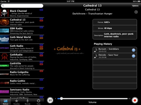 All your favorite and the most popular Goth radio stations in the single application. Cathedral 13, Black Channel, EBM Radio, GothRadio, Goth Metal World and many other stations.