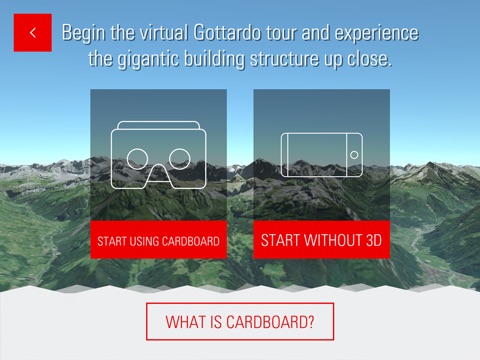 We recommend using Google Cardboard to experience the virtual reality features in 3D. Google Cardboard is a holder made from cardboard that turns your smartphone into a pair of virtual reality glasses, allowing you to enjoy the full Gottardo VR experience in 3D. You can also always use the app’s virtual reality feature without a Cardboard – simply choose the corresponding feature in the app.