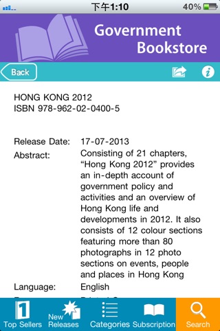 At the online Government Bookstore, you can browse through the list of publications available for sale under various categories. These publications include Top Sellers and New Releases. Details such as title, price, release date and weight will be displayed on the screen. You can also view the cover and extracts of most of the publications