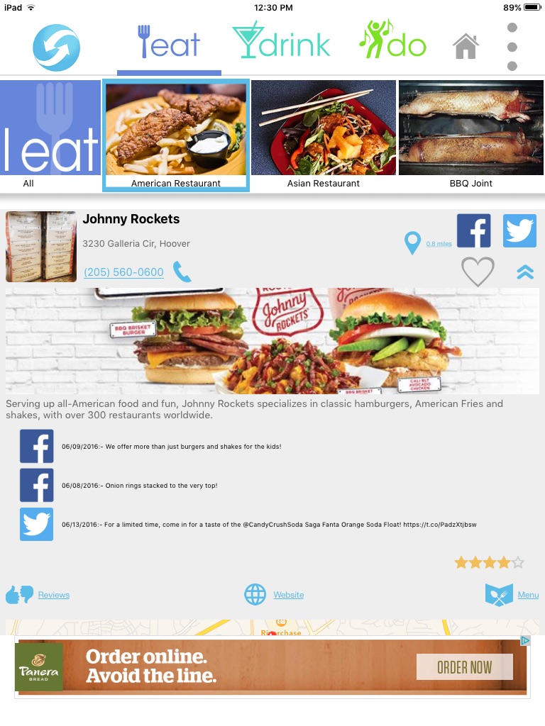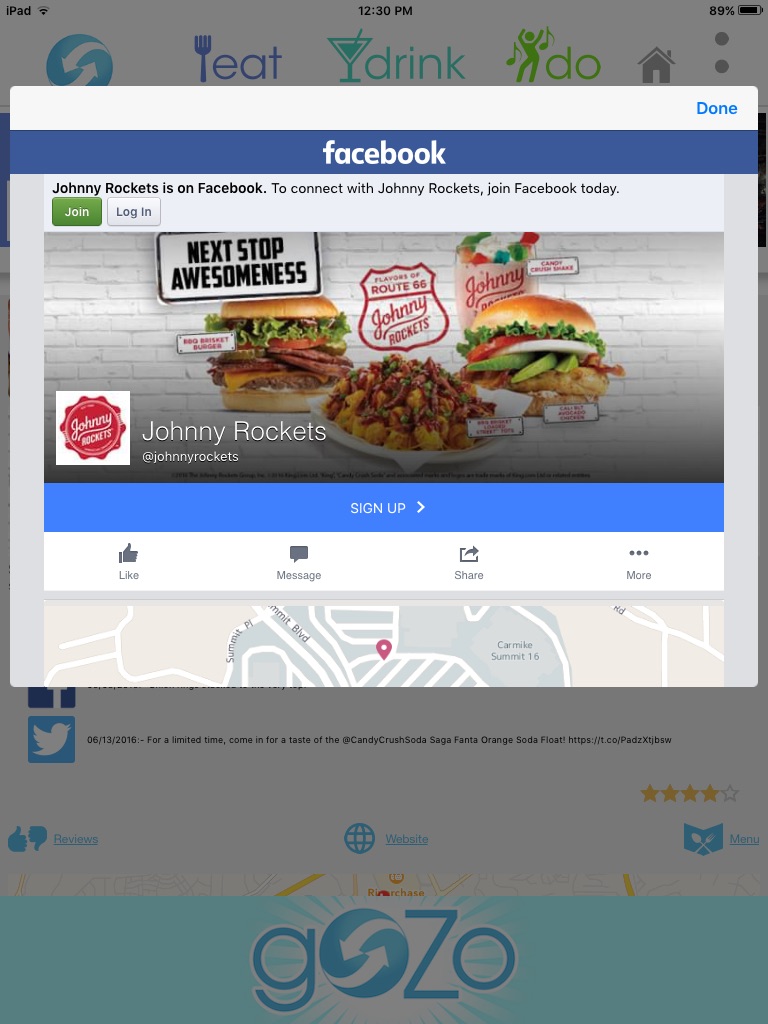 Simply enter your preferences and GOZO will show you, not only businesses that fit your selections, but the social media from those businesses too... so that youll be in the know with the latest buzz on whats happening. Search restaurants, bars & clubs and cultural and entertainment activities from theater to museums. Youll find results for everything in your area... plus youll see their social media posts (Facebook & Twitter) so youll be instantly connecting with what people are saying and doing there. Youll get the scoop on all the latest offers and deals offered there and the ability to share what youve discovered with friends and family...all with the touch of a button. GOZO customizes to your own preferences and interests so you never have to see anything youre not interested in. GOZO becomes unique to you!