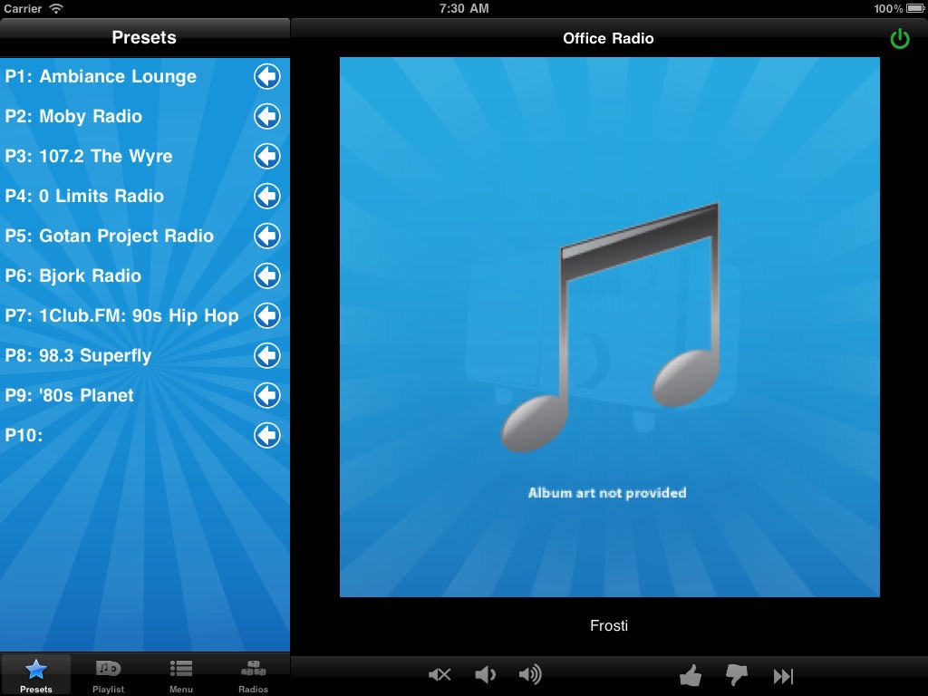 view album art from Pandora and thumbs up or down a song.