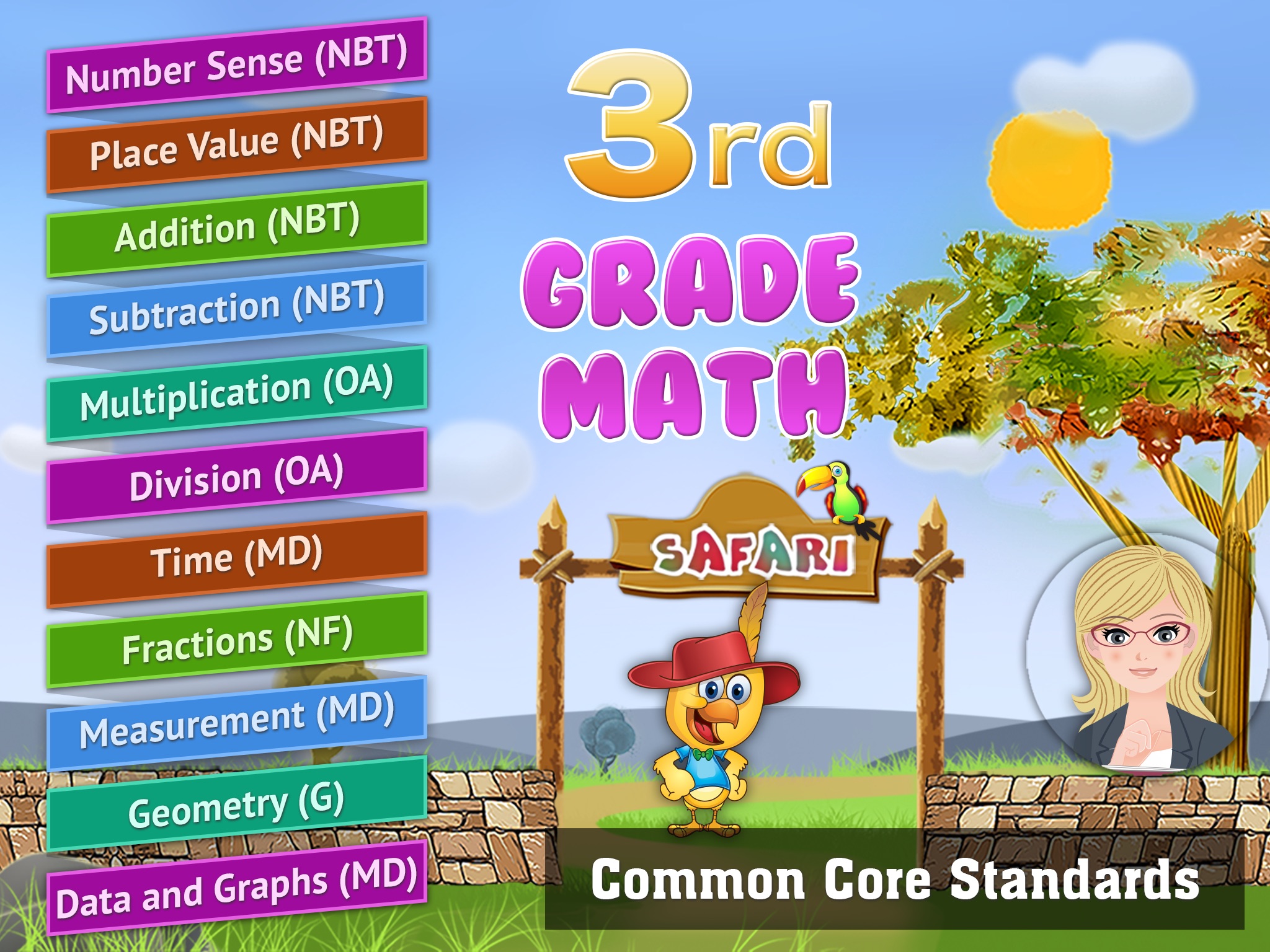 LogTera Grade 3 Math app provides the most fun game for children 5 to 9 years, while comprehensively covering the entire Common Core standards grade level requirements. The app presents math concepts via visual models, word problems, voice prompts, and interactive templates at an adaptive pace that helps elementary school as well as LD learners. The Animal Safari, Avatars, and fun games keep children engaged and motivated to learn new skills. Children answer math questions and earn coins that they can use to add friendly animals to the Safari, and to get food items. Debbie, the dinosaur safari guide, navigates children through the game. Kid friendly HD graphics, animations, voices, and intuitive touch, click, drag and drop style easy to use question templates allow children to work with minimal parent or teacher supervision.