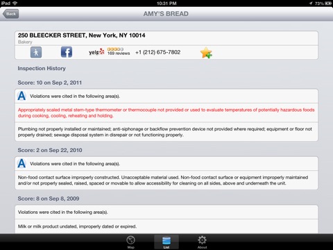 Before you eat, inspect the restaurant! All New York City restaurants on a map, color-coded to reveal the grade provided by the health department. (Green is good; red is bad.) Use your current location to see a map of the immediate area or search for your favorite place. Click through to read a history of its inspections and health violations, then decide to skip dinner, maybe.