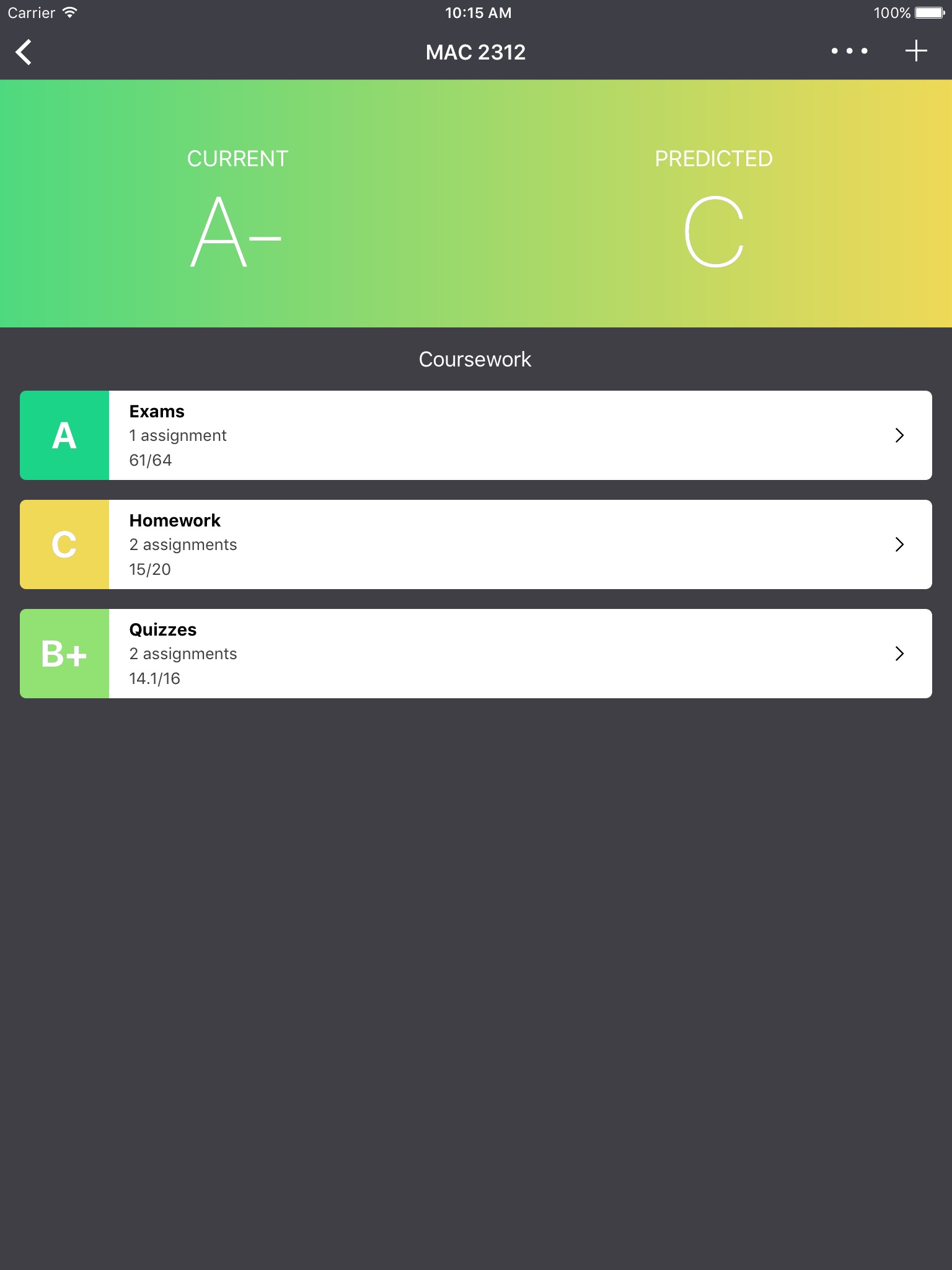 Use Gradient to record your current grades –– and predict your final grades based on assignments that you have yet to complete.