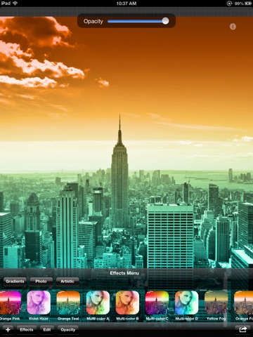 All New in Gradient 2 is our Gradients Effect Editor. Tap the Edit button (or double tap an effected image) to access the editor. Modify an existing effect to create custom looks for your images. Its fun! The new Gradients Effect Editor has enough control to intrigue any digital photo professional, yet its easy enough for a newbie to pick up in just a couple of minutes.