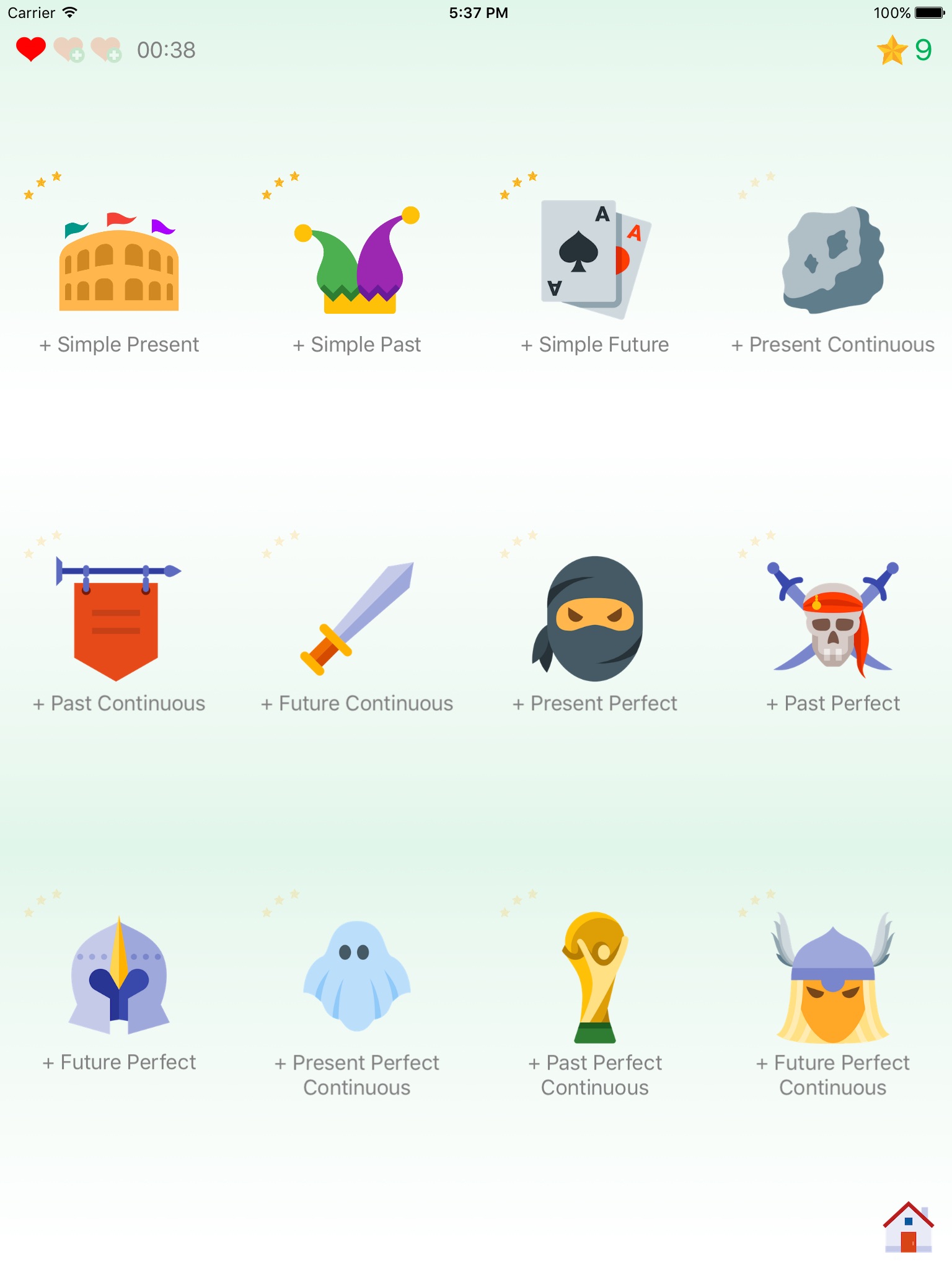 Progress through more than 10 daily used tenses as you race against time to tap the answer. Review your game results with detailed explanations and unlock next level with enough stars!