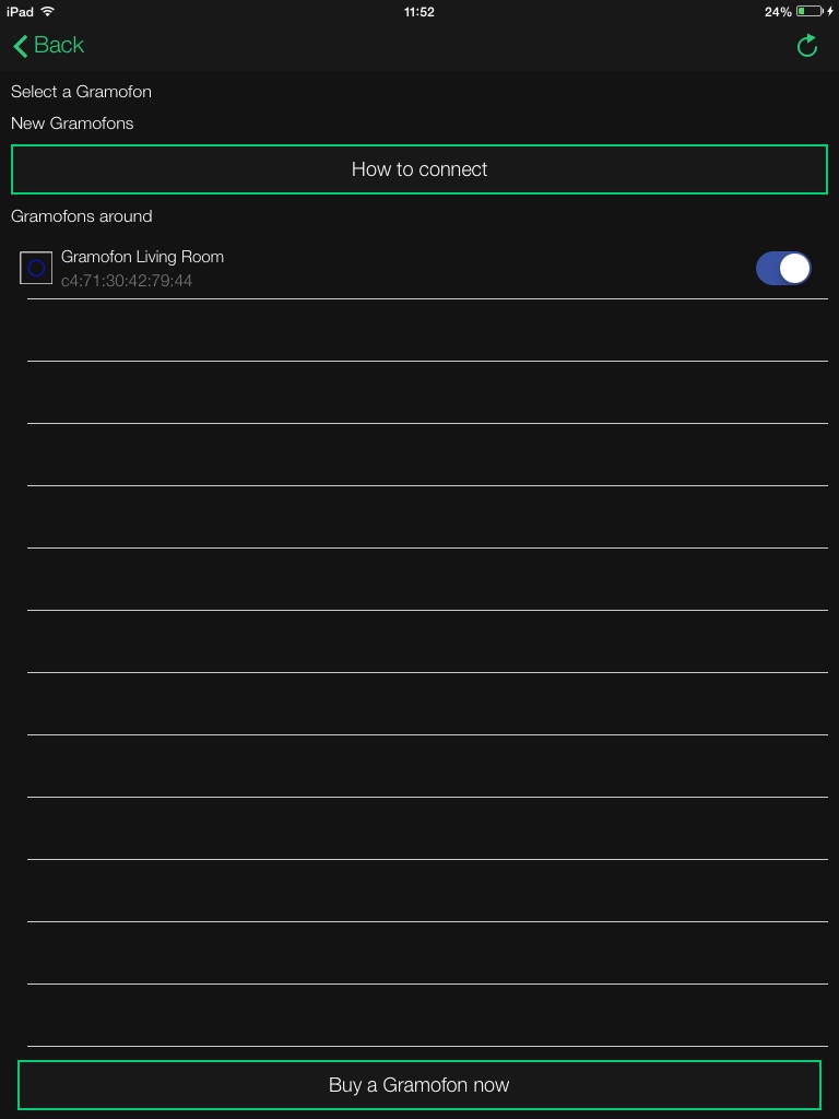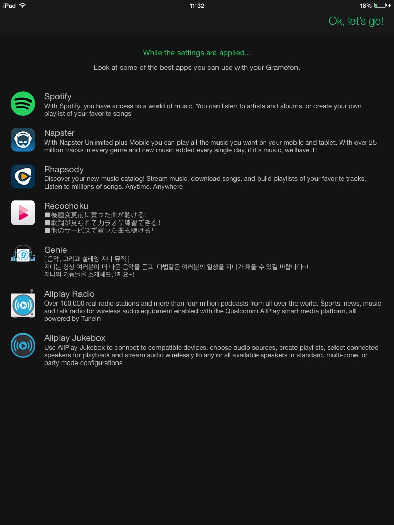 The Gramofon streams cloud music to your sound system. Use your handset or tablet as a remote controller and play music on the Gramofon directly from Spotify, Rhapsody, Napster, Wahwah, TuneIn etc.