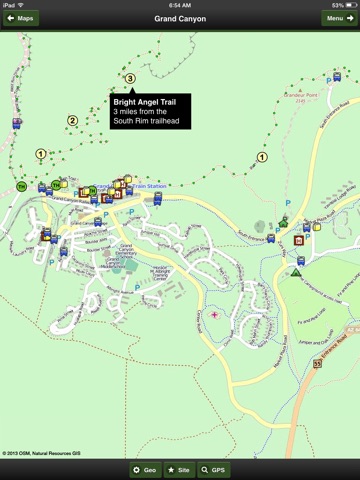 The app has trails with mile markers for the Bright Angel, North Kaibab, Plateau Point, Rim Trail East, Rim Trail West, South Kaibab, River, Clear Creek, Hermit, Monument, Red Canyon, Point Sublime, Tiyo Point, East Tonto, West Tonto Trails.