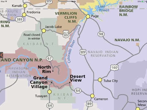 - 5 different maps OFFLINE: Route map, Village and Hermit Road, Desert View Drive, Grand Canyon general map and Hiking trails map.