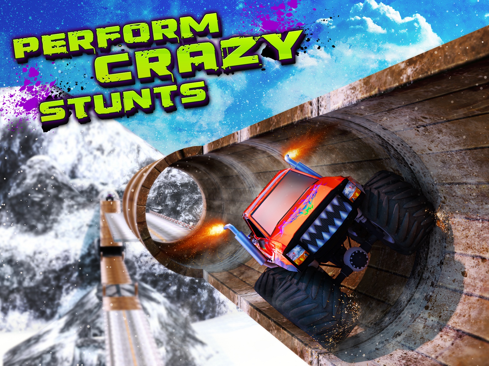 Enjoy the simulation of driving through enormous and mesmerizing landscapes. Have your pick: stormy winter wonderland or arid mountain range. Have the wind blow in your hair! This fully jam-packed adventure might make the blood rush to your head, so GET A MOVE ON, and boast your driving skills to become the Monster Truck Stunts Champion!