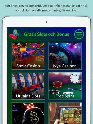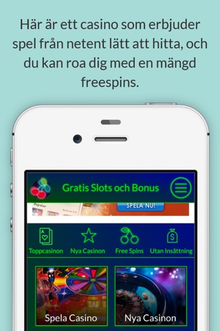 OBS! Appen innehåller inga spel och kostar inga pengar. Appen ska ses som en informationskälla om nätcasinos, slots, roulette och blackjack. Appen hänvisar till nätcasinos där du kan få bonusar, gratissnurr och bonusar som inte kräver någon insättning.