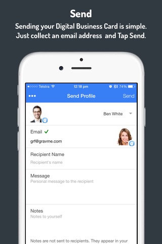 (A) Here is a short video demonstrating how to setup your digital business card and send it to someone - http://gravme.com/video