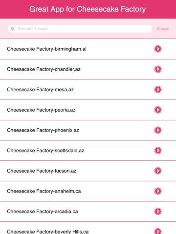 √ POI Search available for all Cheesecake Factory Restaurants. Search everything at any Restaurant.