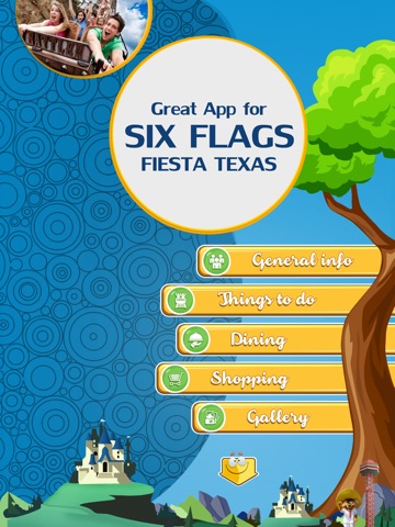 The premier Six Flags Fiesta Texas Guide app includes visitor info, rides, theme parks, water parks, kids rides, shows, hotels, shopping, dining, park hours, attractions, photo gallery, poi search, translator, world clock.