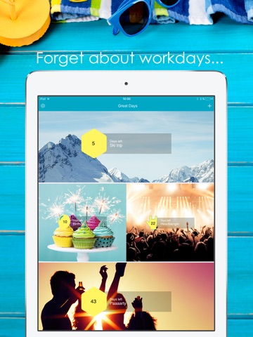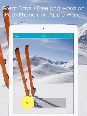 Countdown to those Great days with style - synced across all your iOS devices! Choose a premium background image from one of the included image packs or use one of your own! Just set the date for that wedding, vacation, Concert or Christmas Party and count the days..
