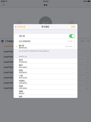 6. 支持设定学习词汇表(比如四级词汇,六级词汇等)。设定词汇表后,课文中将标记词汇表中包含的单词。对于需要应付考试的用户,方便了解课文中哪些单词是需要重点记忆的。