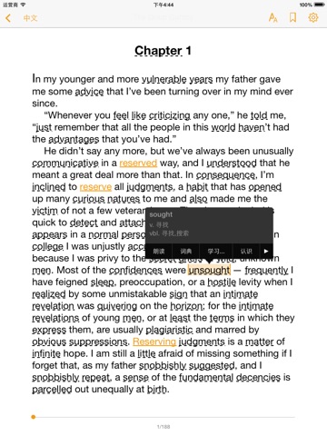 【听阅】,是专为英语学习者们打造的一款可以轻松提高英语听读能力的应用。此应用为听阅系列书籍的《了不起的盖茨比》,包含原版书,中英对照,并提供真人有声朗读。