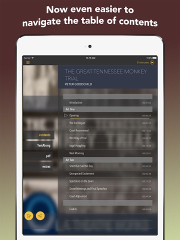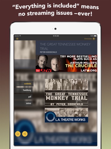 The Great Tennessee Monkey Trial (by Peter Goodchild) is presented by L.A. Theatre Works. This standalone audiobook app combines a professional audio recording, synchronized text, and supplemental features for download-once, grab-and-go anywhere enjoyment.