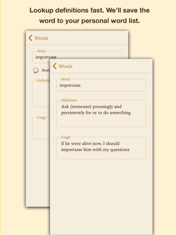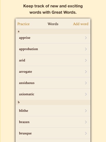 Great Words keeps track of new and exciting words you encounter and helps ingrain them into your everyday vocabulary.