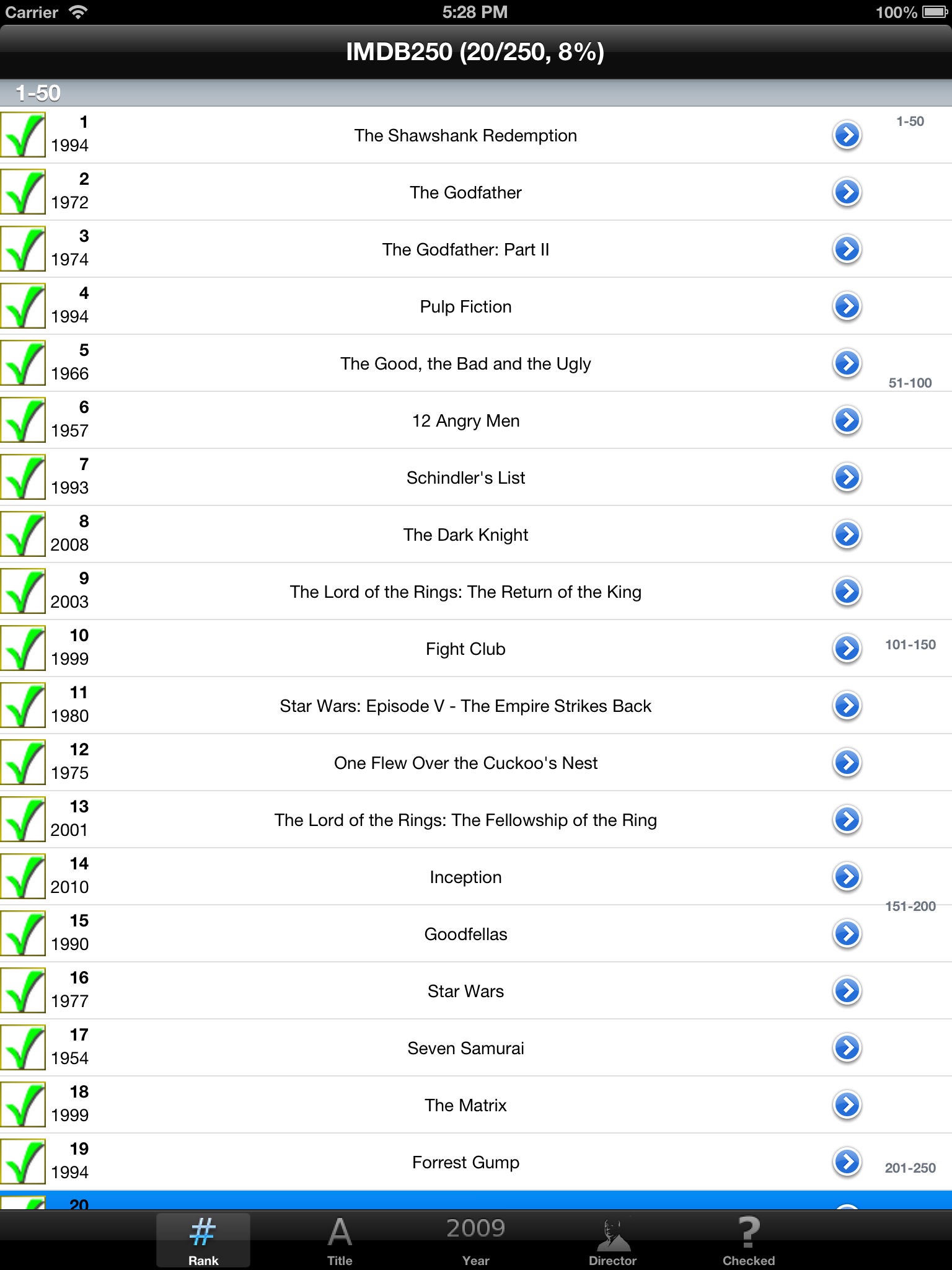 A personal checklist of the 250 Greatest Films of all time, as published by the popular IMDB website. Expand your film universe by watching all two hundred fifty films on this diverse, international, ever-evolving list. Experience the best films humanity has yet to offer.