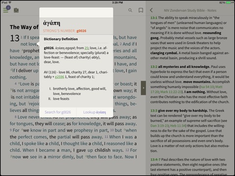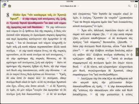 I have the Greek NT open in the left column, set so that I can touch a word and the definition and parsing pop up; and in the right column I have the English translation, also set so I can see the Greek equivalent when I tap a word, along with concordance info. Amazing. I love it!