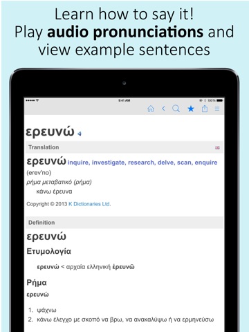 Free offline Greek dictionary and thesaurus plus Greek to English translations. Play audio pronunciations of words, save unlimited bookmarks, and use voice searches.