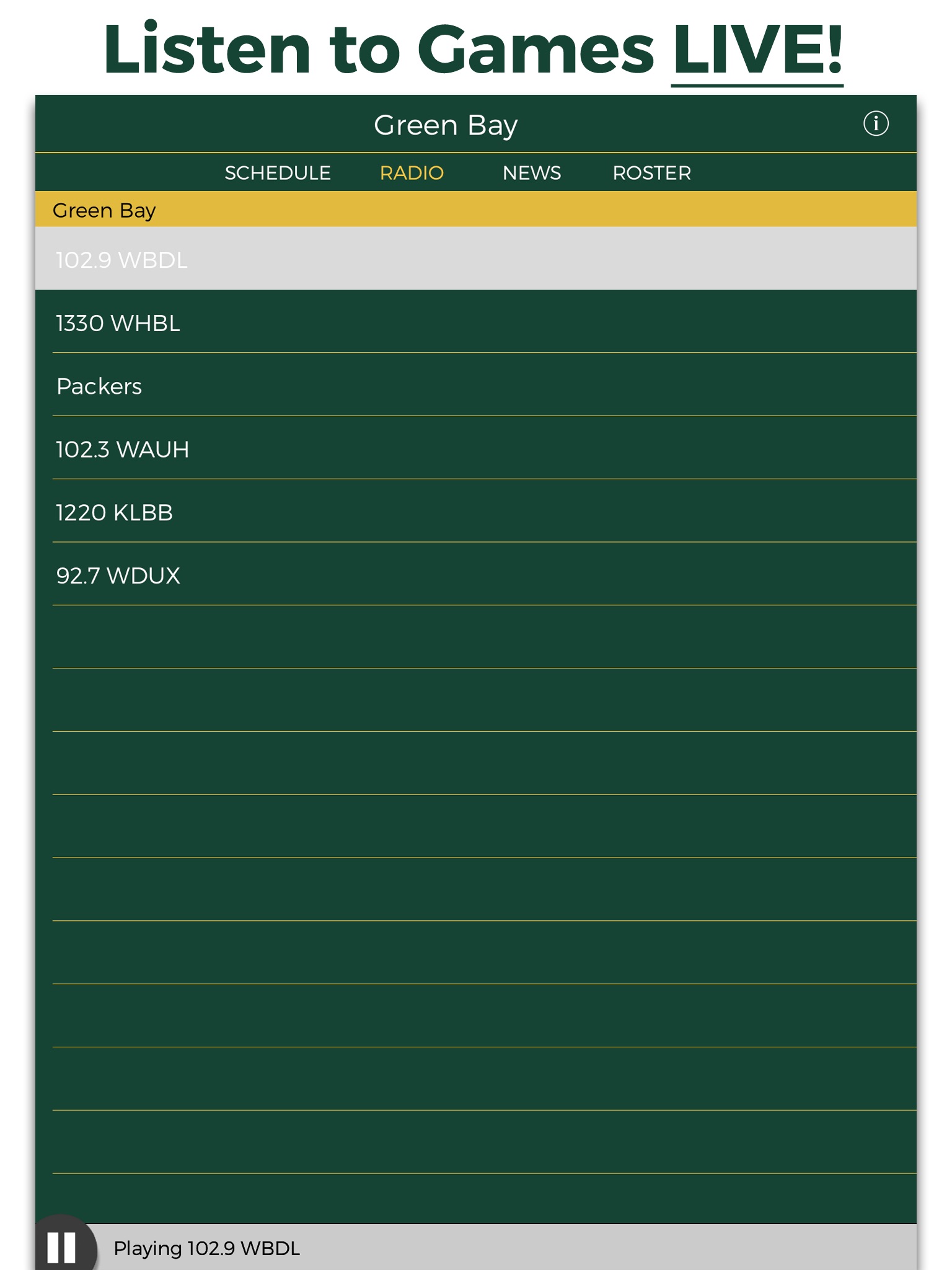 Terrible app. Most radio stations either crash your app or simply wont play. Ones that do play DO NOT have the game on. I found one station with the game on... For the opposite team (bears) because thats what I want to hear from a packers radio app.. The bears announcers... Gets one star for having the game on ONE of 15 stations....