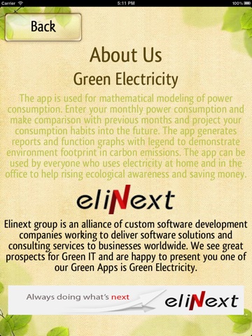 The app is used for mathematical modeling of power consumption. Enter your monthly power consumption and make comparison with previous months and project your consumption habits into the future. The app generates reports and function graphs with legend to demonstrate environment footprint in carbon emissions. The app can be used by everyone who uses electricity at home and in the office to help rising ecological awareness and saving money.