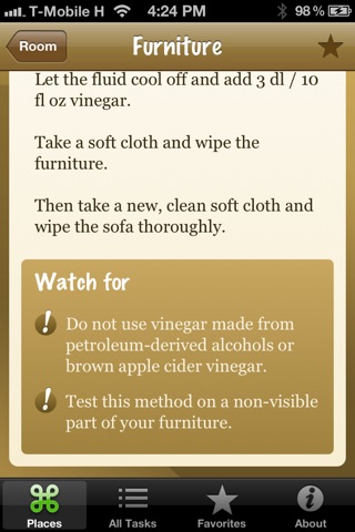Solutions are organized by place of appearance (e.g. living room, kitchen, bathroom), but theres a complete listing too. Some solutions contain more than one variant, so be sure to explore them. Read the "Watch for" section at the end for advices and warnings specific to a given solution and the materials used there. And of course you can save your frequently used solutions to the Favorites list.