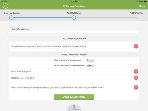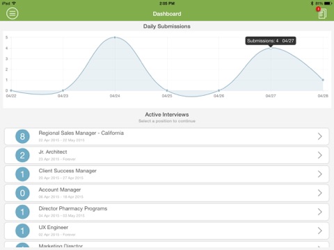 GreenJob Pro is an easy, on-the-go scheduling and reviewing tool. It is a complete, hand-held version of our on-demand, recorded interviewing solution GreenJob One-Way. Create and schedule One-Way interviews with just a few taps on your mobile device and get notified for each new candidate submission! After your candidates have recorded their video and text responses to your questions, use GreenJob Pro to review, evaluate, and share those recordings from anywhere, at any time! Collaborate with your recruiting team at your convenience to screen the best candidates for the position .