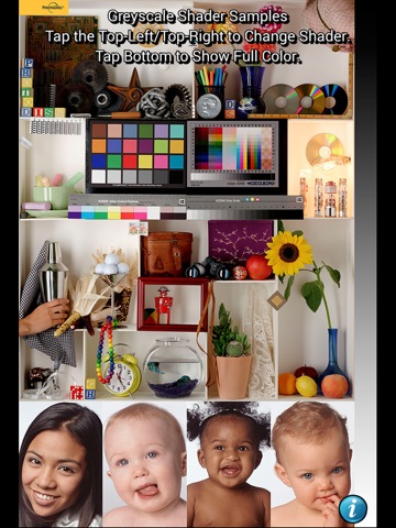 To switch between the shaders, tap anywhere in the top-right or top-left of the image to move forward/back in the list. Tap anywhere on the bottom of the image to toggle between the full-color image and the currently-selected greyscale image. Toggling between the color and greyscale versions of an image allows the user to carefully inspect the results of each shader.