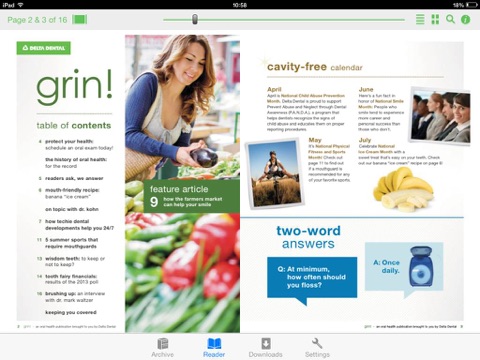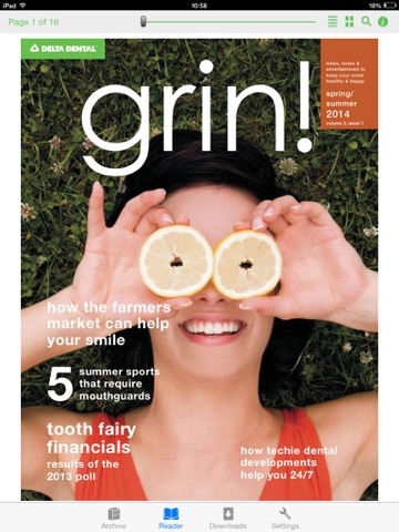 News, notes and entertainment to keep your smile healthy and happy from Delta Dental. Grin!, brought to you by Delta Dental, is a free quarterly magazine that provides healthy living tips, mouth-friendly recipes, broad dental benefits information and other general interest content focused on oral health.